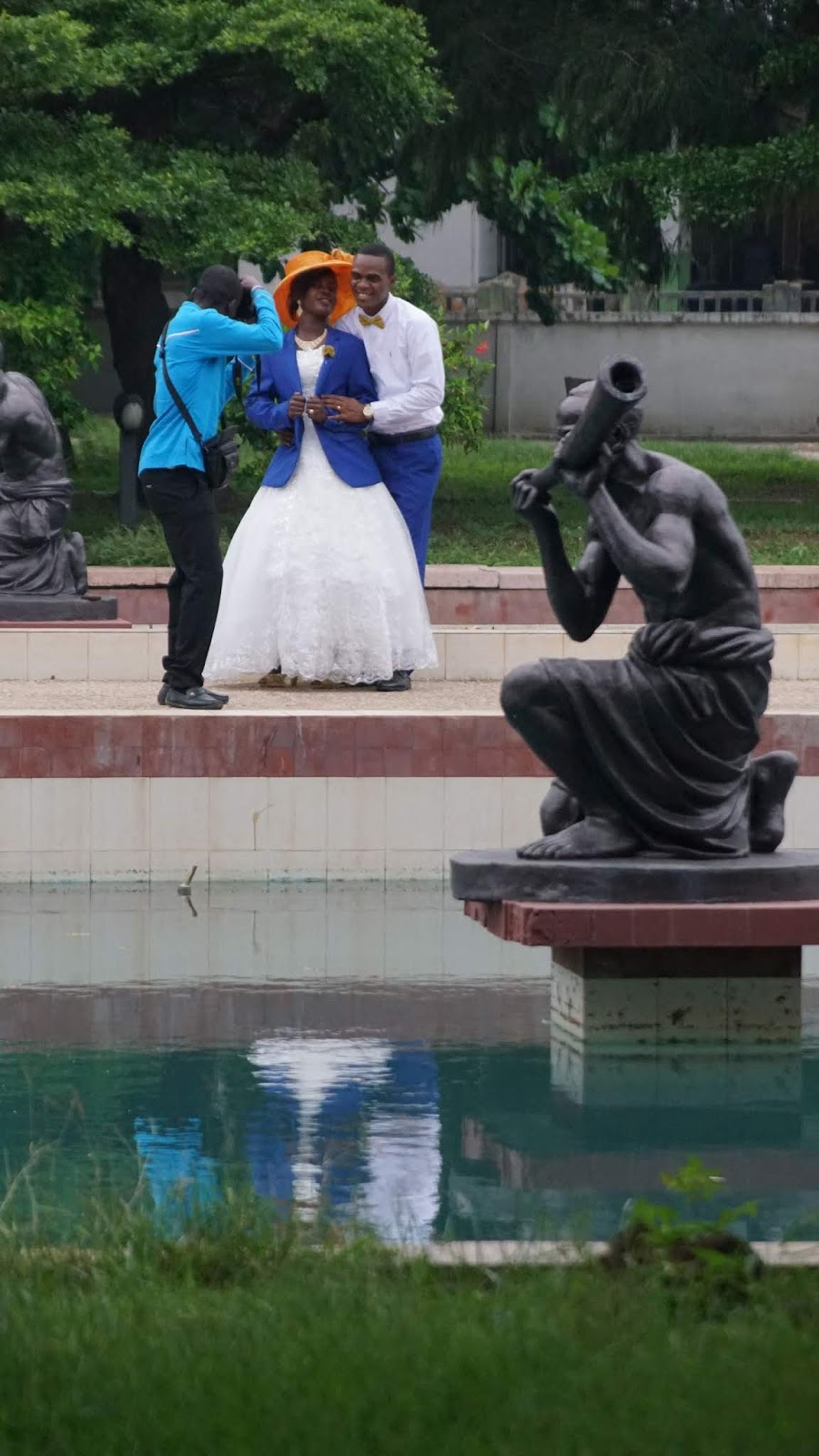 We then take a walk in the park around the pools populated by statues of traditional musicians and near which newlyweds come to have their picture taken.